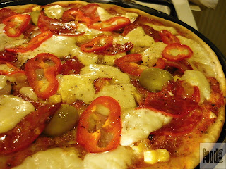 Ei eu unul am pus asa: ciuperci champignons, cateva fidelute de salam sasesc, ardei kapia, doi catei de usturoi, o jumatate de ceapa alba, cateva masline fara samburi si o mana de mix de legume congelate, mai exact morcov, mazare si alte verdeturi care nu le-am "dibuit". Pentru "udat" am pus jumatate de pahar de vin alb sec si cam 500ml de supa de pui.